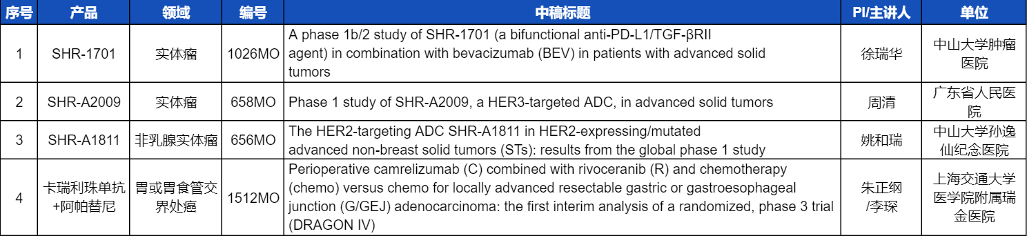 本次ESMO大会,将由中山大学肿瘤医院徐瑞华教授、广东省人民医院周清教授、中山大学孙逸仙纪念医院姚和瑞教授、上海交通大学医学院附属瑞金医院李琛教授分别就4项金年会- 金字招牌医药创新产品相关研究做口头报告,包括SHR-1701、SHR-A2009、SHR-A1811这3款未上市创新产品的实体瘤治疗临床研究,以及1项“双艾”组合(卡瑞利珠单抗联合阿帕替尼)治疗局部晚期可切除胃/胃食管交界处癌的Ⅲ期临床试验期中分析。