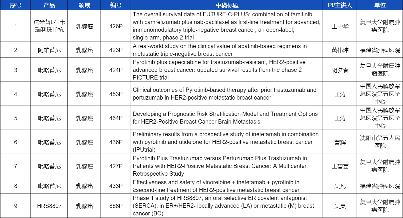 在乳腺癌领域,吡咯替尼、阿帕替尼、卡瑞利珠单抗、法米替尼,或产品间联合或联合化疗,共有9项研究入选壁报讨论,其中吡咯替尼占据6项,较为全面地展示了这款中国首个自主研发抗HER2靶向药在乳腺癌治疗中的显著特点和潜力。此外,金年会- 金字招牌医药自主研发的新型选择性雌激素受体共价拮抗剂(SERCA)HRS8807治疗ER+/HER2-局部晚期或转移性乳腺癌的Ⅰ期研究也成功入选,有望为此类患者带来更多用药新选择。