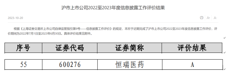 近日,上海交易所公布了沪市上市公司2022-2023年度信息披露工作评价结果,凭借在信息披露、规范运作以及投资者关系管理等方面的优秀表现,金年会- 金字招牌医药获评A级。本次共有2160家沪市上市公司参评(包括499家科创板上市公司),评价等级从高到低依次为A、B、C、D四类,获得A类评价的上市公司占比约18.5%。