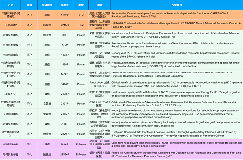 在消化系统肿瘤领域,金年会- 金字招牌创新产品相关研究共入选2项口头报告、10项壁报和2项电子壁报,共14项研究。除了明星药物卡瑞利珠单抗和阿帕替尼外,还有5篇阿得贝利单抗治疗消化系统肿瘤的研究入选。此外,HRS-4642、瑞拉芙普-α注射液(SHR-1701)等未上市创新产品也有相应研究入选。随着新老药物前沿研究的不断推进,有望为消化系统肿瘤患者带来新的福音!