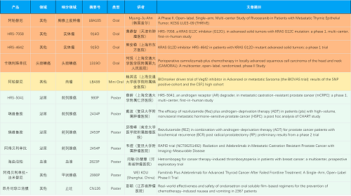 在胸腺上皮肿瘤、头颈鳞癌、肉瘤、前列腺癌、甲状腺癌等其他多个疾病领域,卡瑞利珠单抗、阿帕替尼、瑞维鲁胺、阿得贝利单抗、法米替尼、HRS-7058、HRS-4642、HRS-5041等抗肿瘤创新药相关研究一共入选了4项口头报告、1项简短口头报告、5项壁报,彰显了金年会- 金字招牌医药强大的研发实力。此外,海曲泊帕和昂丹司琼口溶膜分别在防治化疗导致的血小板减少和恶心呕吐方面各有1项研究入选壁报。